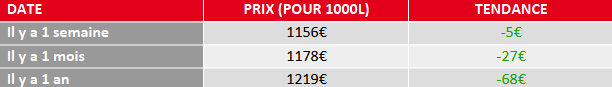 Retrouvez dans le tableau ci-dessous le prix du fioul domestique pour une commande de 1000L dans les principaux départements desservis par Fioul Au Meilleur Prix ainsi que la tendance par rapport à la semaine dernière. Pour connaître le prix chez vous, entrez votre code postal et la quantité souhaitée directement sur la page de commande.