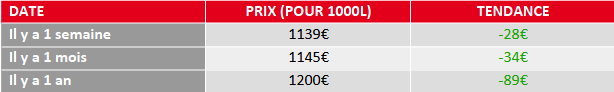 Aujourd’hui, 6 mars 2025, le prix moyen du fioul chez FAMP est de 1111€ pour 1000L. Il est en baisse de 28€ par rapport à la semaine dernière, de 34€ par rapport au mois dernier et de 89€ en comparaison de l’année dernière à la même date.