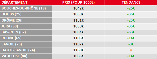 Retrouvez dans le tableau ci-dessous le prix du fioul domestique pour une commande de 1000L dans les principaux départements desservis par Fioul Au Meilleur Prix ainsi que la tendance par rapport à la semaine dernière. Pour connaître le prix chez vous, entrez votre code postal et la quantité souhaitée directement sur la page de commande.