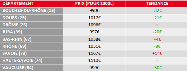 Retrouvez dans le tableau ci-dessous le prix du fioul domestique pour une commande de 1000L dans les principaux départements desservis par Fioul Au Meilleur Prix ainsi que la tendance par rapport à la semaine dernière. Pour connaître le prix chez vous, entrez votre code postal et la quantité souhaitée directement sur la page de commande.