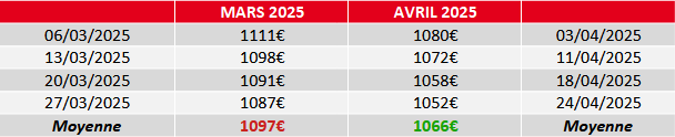 Au mois d’avril, le prix du fioul a fortement baissé par rapport à mars. Il est passé de 1097€ en moyenne pour une commande de 1000L à 1066€, soit une forte baisse de 31€.