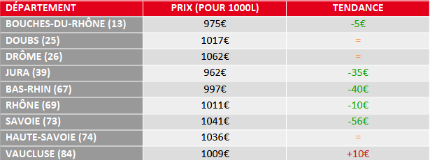 Retrouvez dans le tableau ci-dessous le prix du fioul domestique pour une commande de 1000L dans les principaux départements desservis par Fioul Au Meilleur Prix ainsi que la tendance par rapport à la semaine dernière. Pour connaître le prix chez vous, entrez votre code postal et la quantité souhaitée directement sur la page de commande.