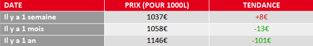 Retrouvez dans le tableau ci-dessous le prix du fioul domestique pour une commande de 1000L dans les principaux départements desservis par Fioul Au Meilleur Prix ainsi que la tendance par rapport à la semaine dernière. Pour connaître le prix chez vous, entrez votre code postal et la quantité souhaitée directement sur la page de commande.