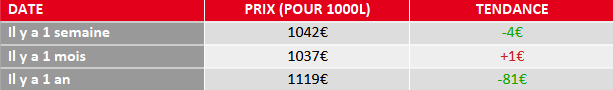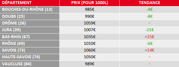 Retrouvez dans le tableau ci-dessous le prix du fioul domestique pour une commande de 1000L dans les principaux départements desservis par Fioul Au Meilleur Prix ainsi que la tendance par rapport à la semaine dernière. Pour connaître le prix chez vous, entrez votre code postal et la quantité souhaitée directement sur la page de commande.