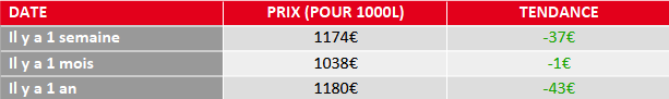Aujourd’hui, 3 juillet 2025, le prix moyen du fioul chez FAMP est de 1137€ pour 1000L. Il est en baisse de 37€ par rapport à la semaine dernière, de 1€ par rapport au mois dernier et de 43€ en comparaison de l’année dernière à la même date.