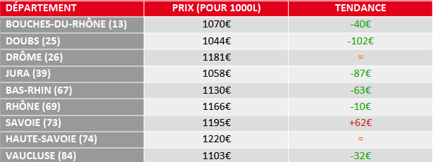 Retrouvez dans le tableau ci-dessous le prix du fioul domestique pour une commande de 1000L dans les principaux départements desservis par Fioul Au Meilleur Prix ainsi que la tendance par rapport à la semaine dernière. Pour connaître le prix chez vous, entrez votre code postal et la quantité souhaitée directement sur la page de commande.