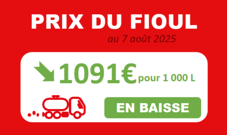 Aujourd’hui, 7 août 2025, le prix moyen du fioul chez FAMP est de 1091€ pour 1000L. Il est en baisse de 20€ par rapport à la semaine dernière, de 48€ par rapport au mois dernier et de 18€ en comparaison de l’année dernière à la même date.