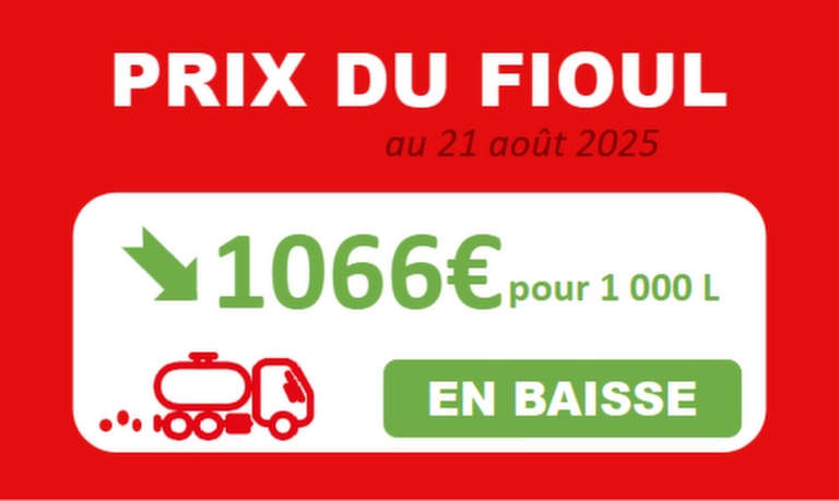 Aujourd’hui, 21 août 2025, le prix moyen du fioul chez FAMP est de 1066€ pour 1000L. Il est en baisse de 8€ par rapport à la semaine dernière, de 59€ par rapport au mois dernier et de 48€ en comparaison de l’année dernière à la même date.