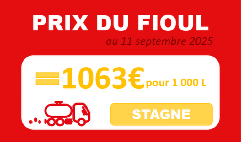 Aujourd’hui, 11 septembre 2025, le prix moyen du fioul chez FAMP est de 1063€ pour 1000L. Il est en baisse de 1€ par rapport à la semaine dernière, de 11€ par rapport au mois dernier et de 51€ en comparaison de l’année dernière à la même date.