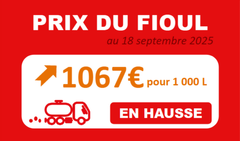 Aujourd’hui, 18 septembre 2025, le prix moyen du fioul chez FAMP est de 1067€ pour 1000L. Il est en hausse de 4€ par rapport à la semaine dernière, de 1€ par rapport au mois dernier et en baisse de 55€ en comparaison de l’année dernière à la même date.